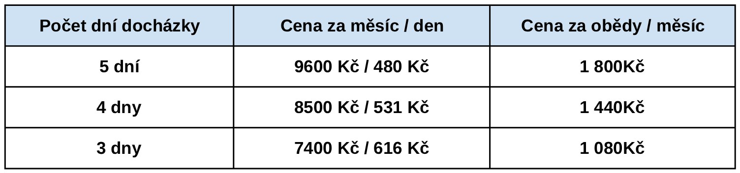 Druhou polovinu vratné kauce, také ve výši měsíčního školkovného, rodiče hradí před nástupem dítěte do školky. Celková vratná kauce je tedy suma ve výši 2 měsíců školkovného.